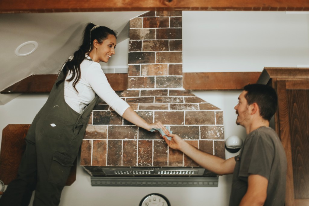 We spent a day just laying the tile and it was one of my favorite jobs yet. It’s supposed to resemble an old chimney, so it didn’t have to be perfect! We decided on a traditional brick pattern with a vertical brick as a solider pattern on the bottom. We had some extra dentil moulding that we finish nailed under the vent hood for some unexpected character. After going back through and grouting everything, our vent hood was officially done.